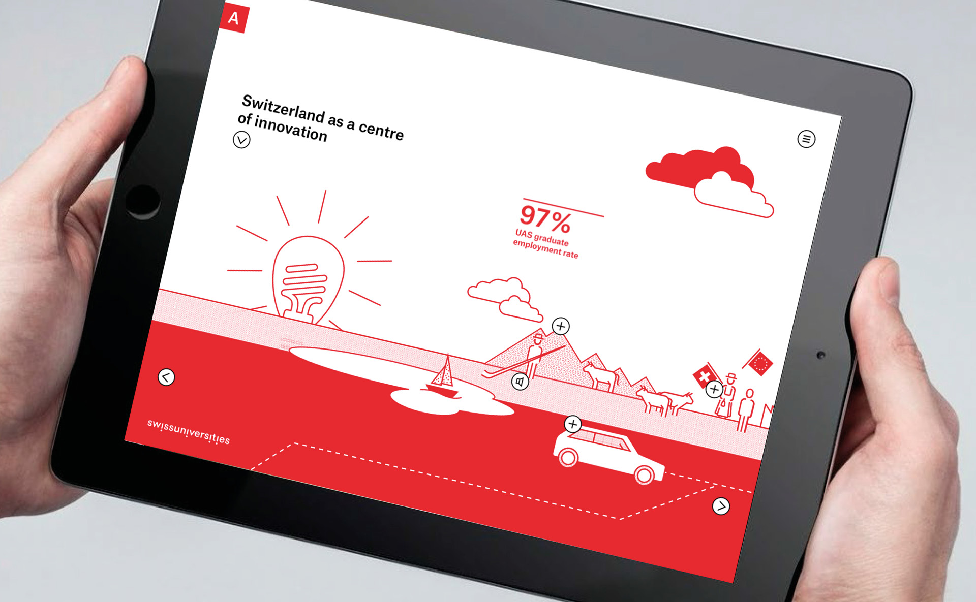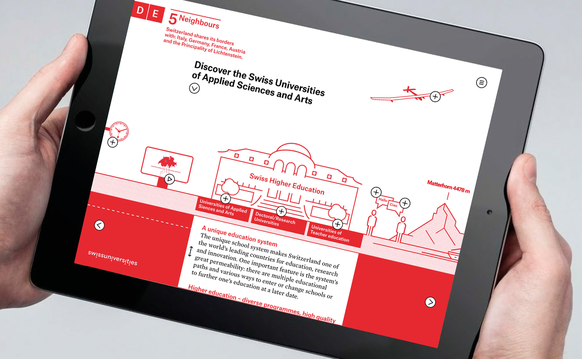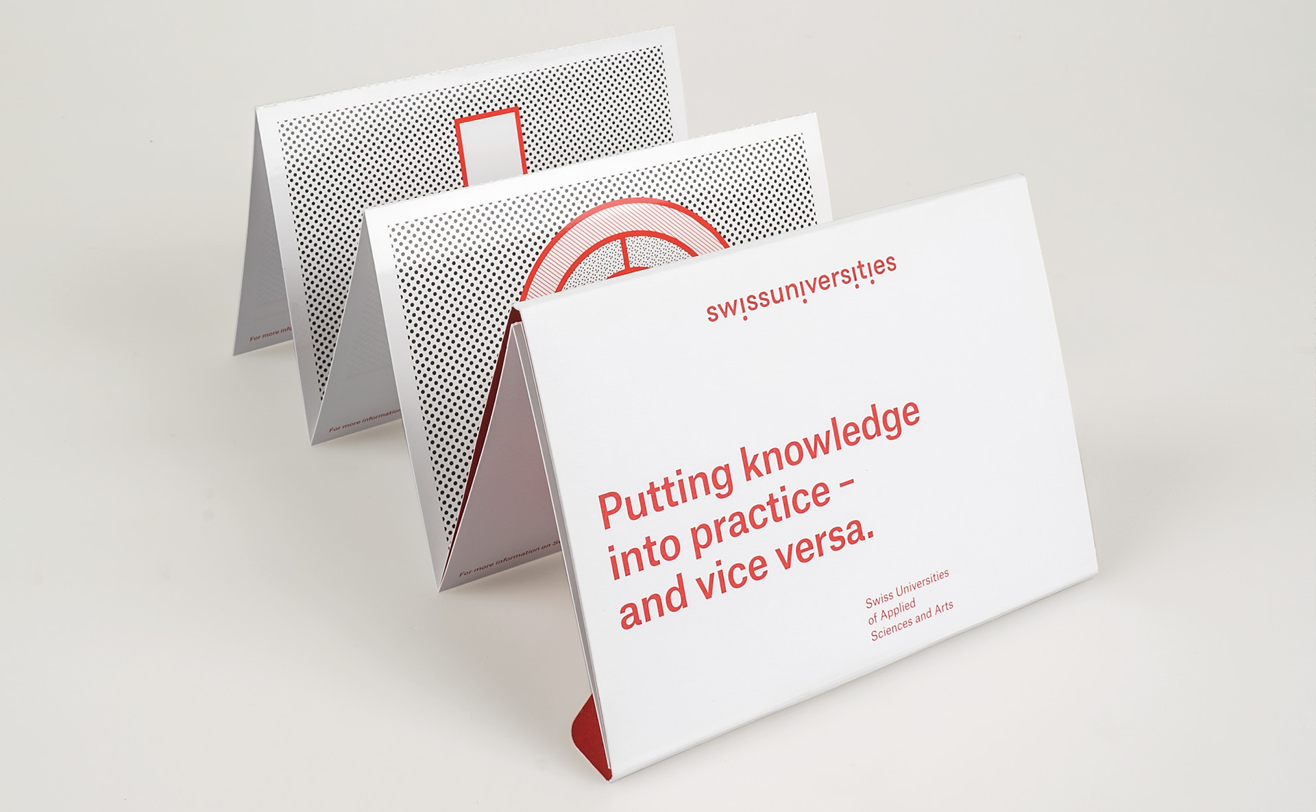 The agency supported swissuniversities in a strategic positioning process and in the development of a strategy for international communication. Our team conceived and designed various means of communication – from the universities of applied science and arts folder with information cards, presentations and postcard sets to a delegation travel blog and digital animations.
