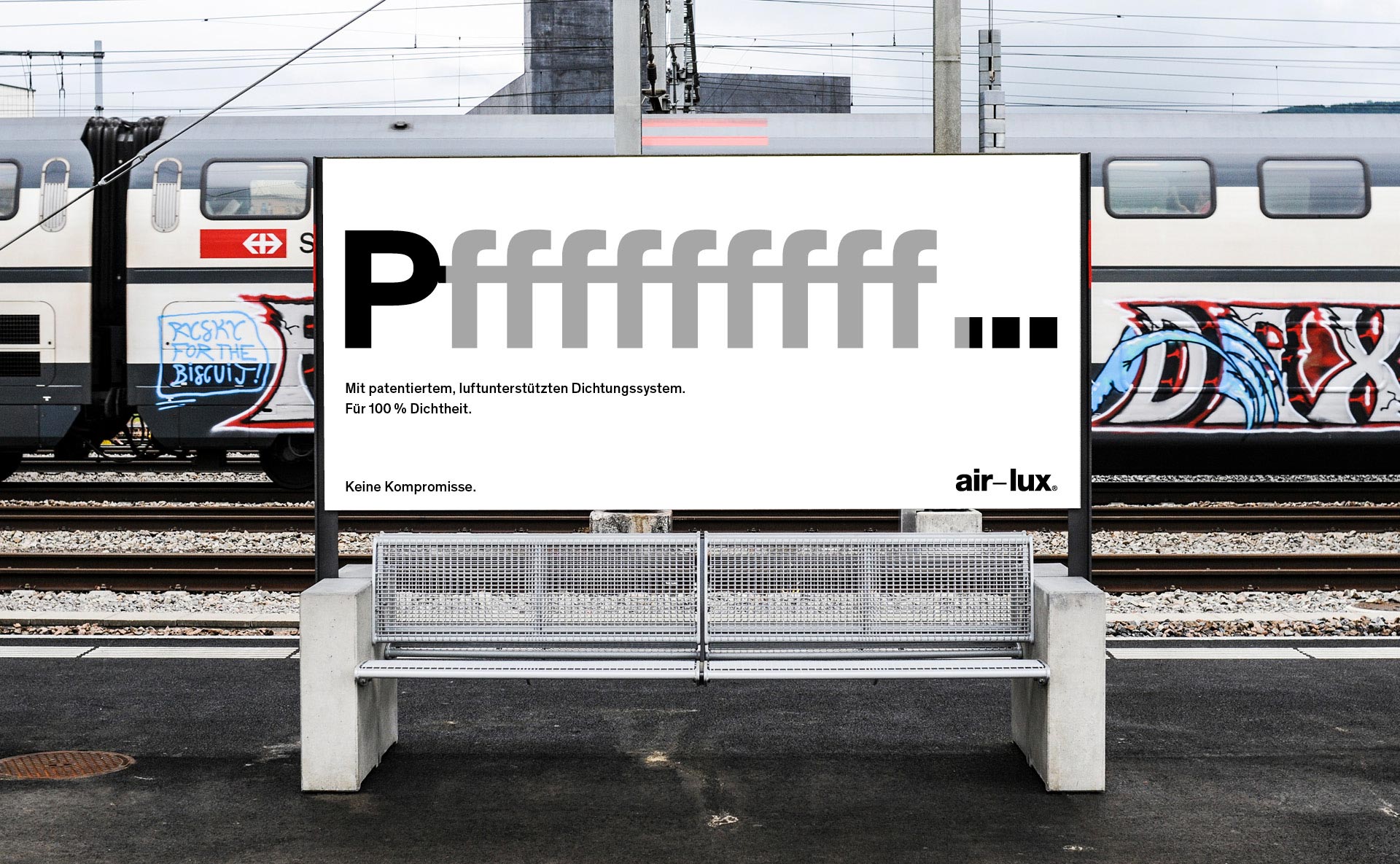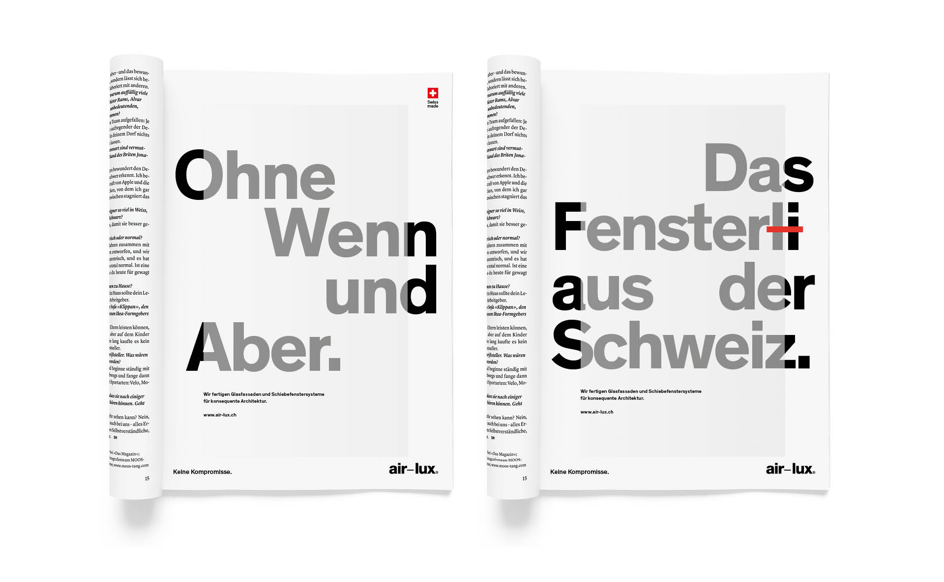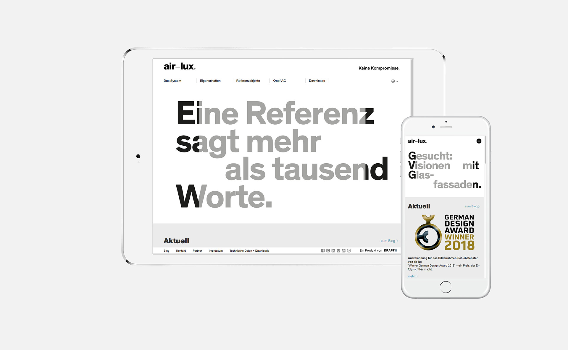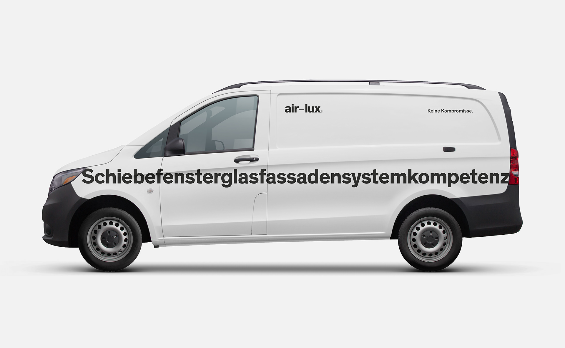 With its new positioning, an atypical appearance in the industry with a lot of white space and a refreshingly blunt tonality, air-lux creates differentiation from competitors at all touch points and conveys the most important messages clearly and distinctly. The typography reflects the massive robustness of the material as well as the horizontality of the sliding window system. Transparencies are used to achieve a “glass-like effect”.
