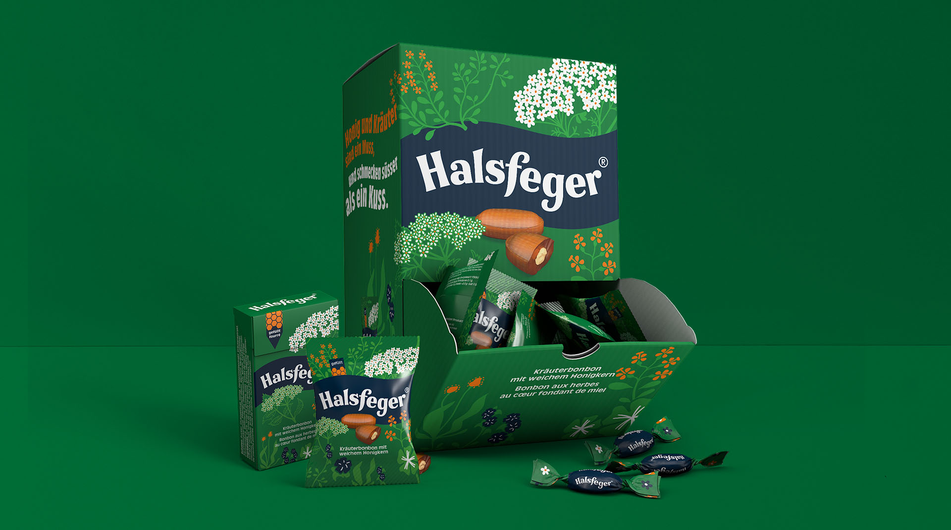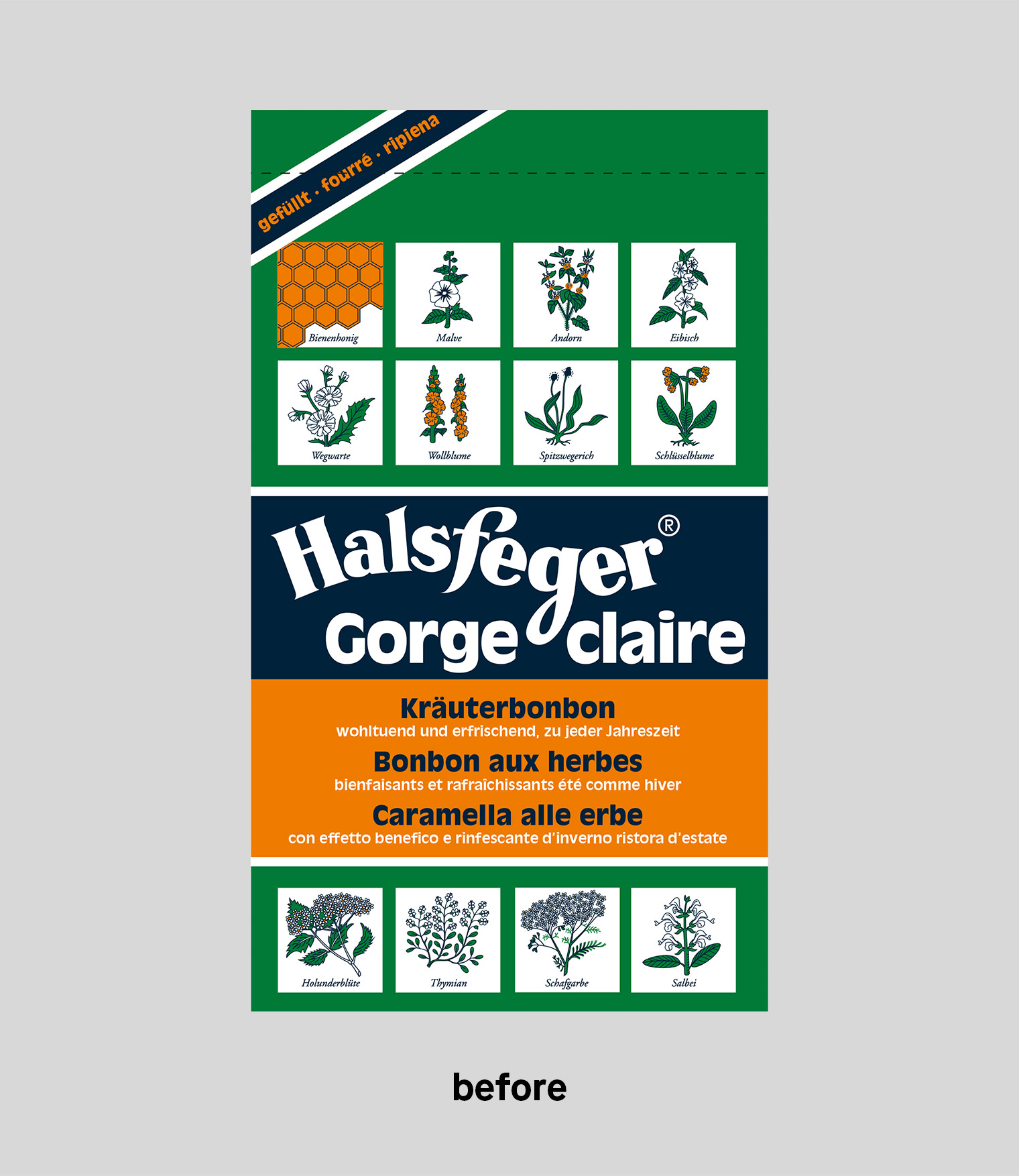 Halsfeger throat lozenges were developed in the 1920s and are thought to be Switzerland’s first soft-centred herbal sweets. The product brand enjoys an extremely high recognition factor in Switzerland, although brand management and marketing has been neglected over recent years. Our aim was to revitalise Halsfeger while retaining its strong traditional values with a view to boosting its appeal to retailers and customers alike.