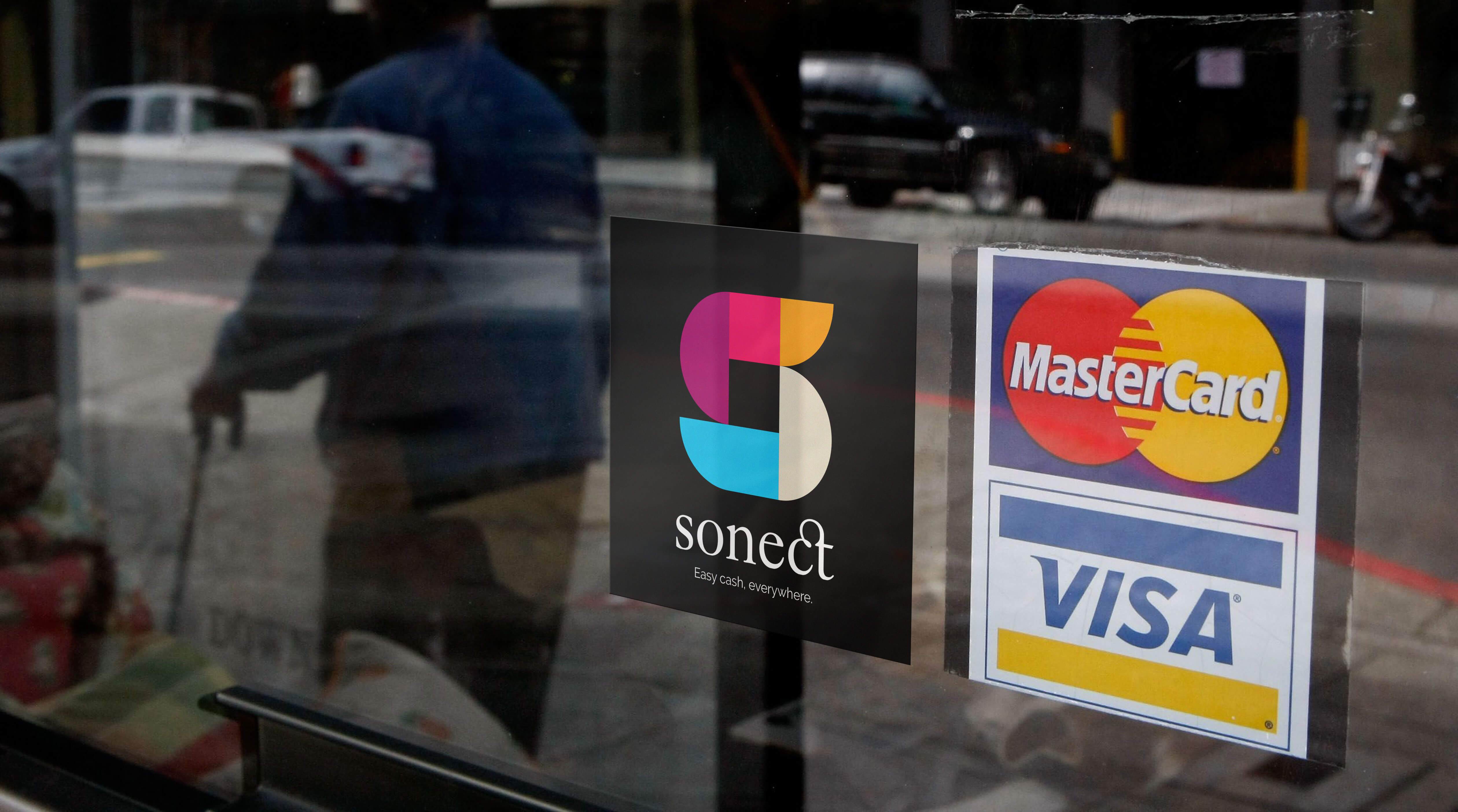 Stickers in store windows indicate where you can use Sonect to withdraw cash.