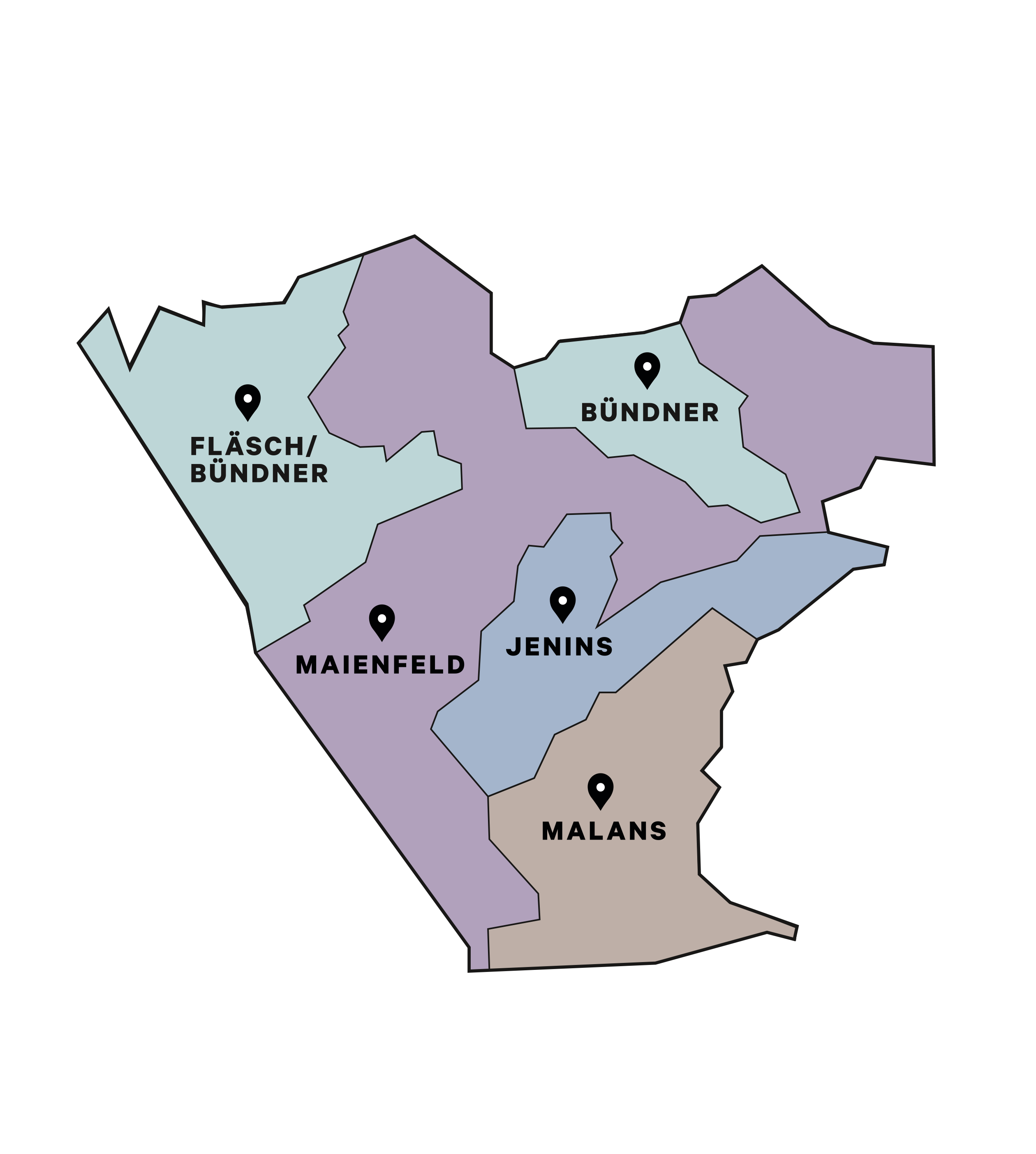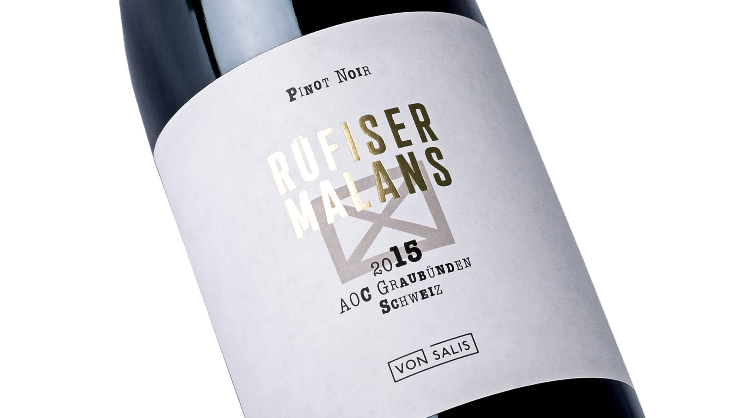 In Maienfeld, Jenins, Malans and Zizers, in the area of Grisons known as the Bündner Herrschaft, we found the same distinctive decorations appearing again and again, on newer buildings as well as historical ones. These are known as sgraffiti and are part of the region’s architectural culture. The motifs, porches, windows and gable decorations are abstract, e.g. in bands with triangle motifs or circular ornaments. A characteristic sgraffito motif was allocated to each of the four different wine regions and used as a distinguishing basic design component. The categorization of individual wine varietals and pricing groups thus led to simple, authentic graphic compositions. The von Salis wine range thus achieves harmony, even though every bottle is unique.