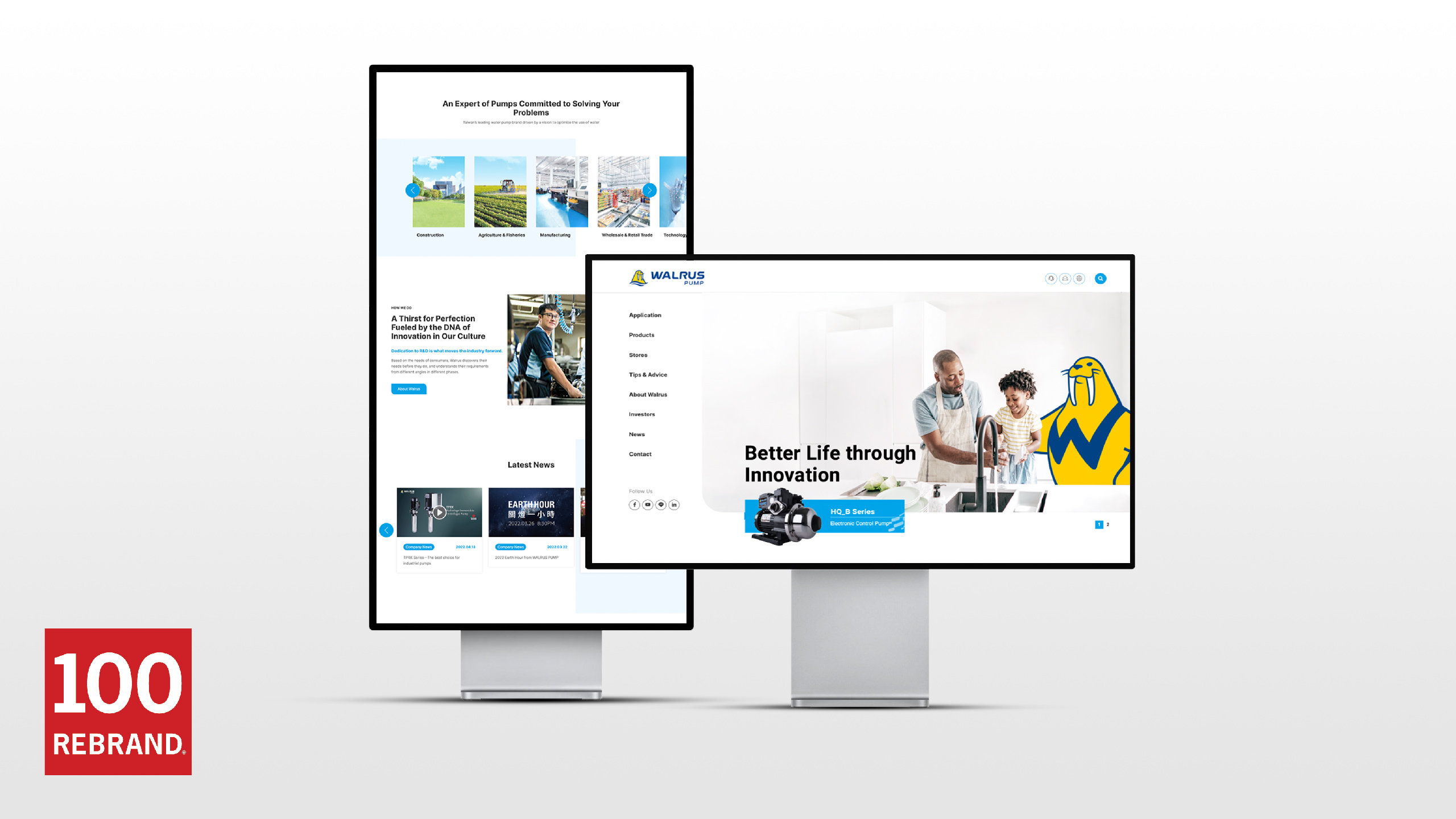 WALRUS大井泵浦在導入品牌策略及識別設計後,內部團隊積極的進行品牌各項落地工程,包括行銷及經銷商應用、線上媒體建置、展覽活動…等,也同步進行IPO、高雄路竹環球廠興建計畫,以及提升雇主品牌形象。從品牌再造開始歷經四年的時間,WALRUS大井泵浦團隊在每個品牌溝通內容與應用,堅持完整依循品牌策略與規範,進行國際佈局與行銷推廣。