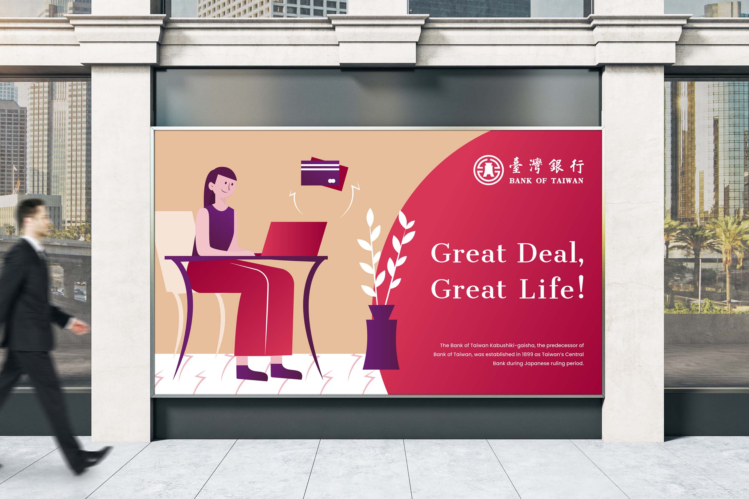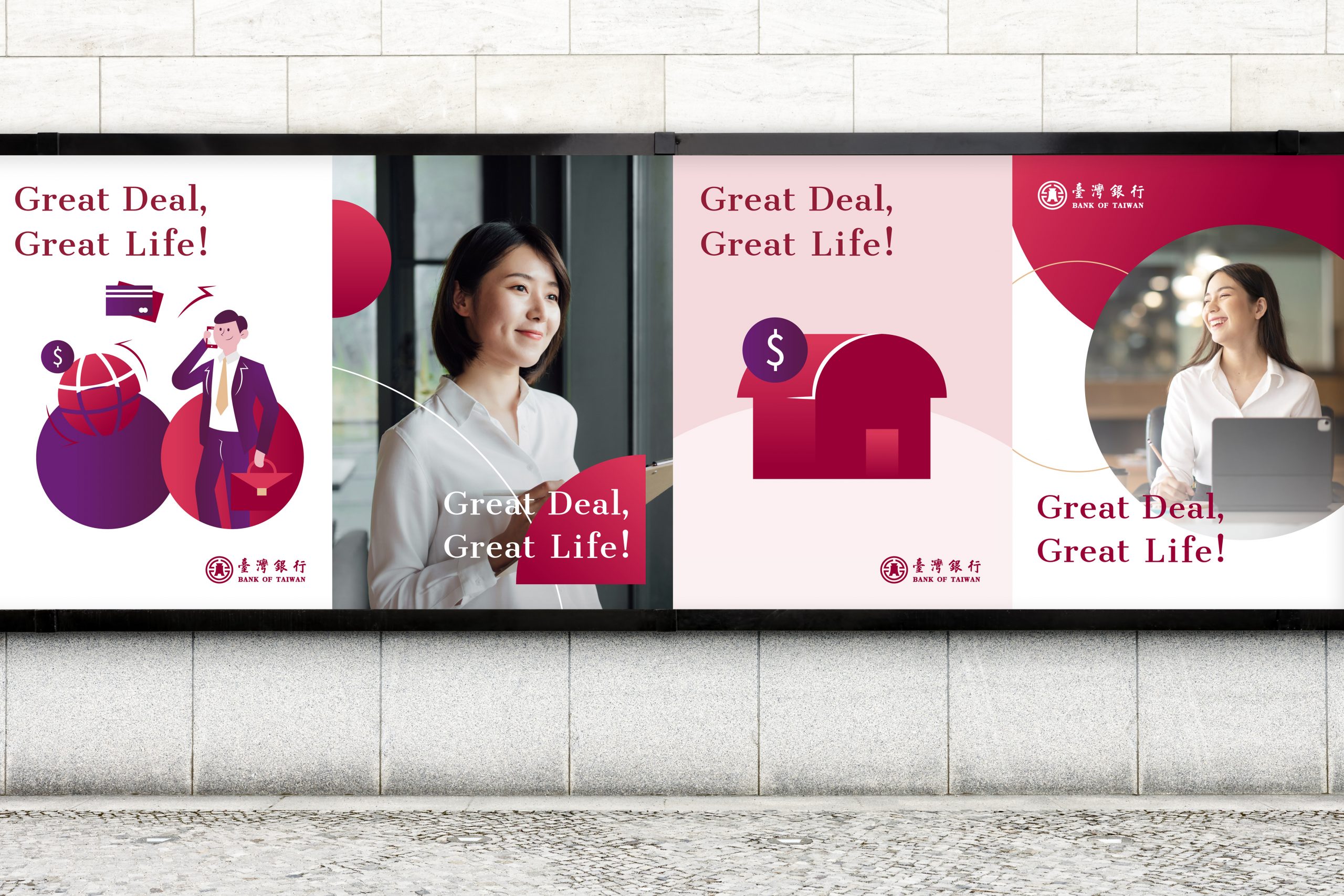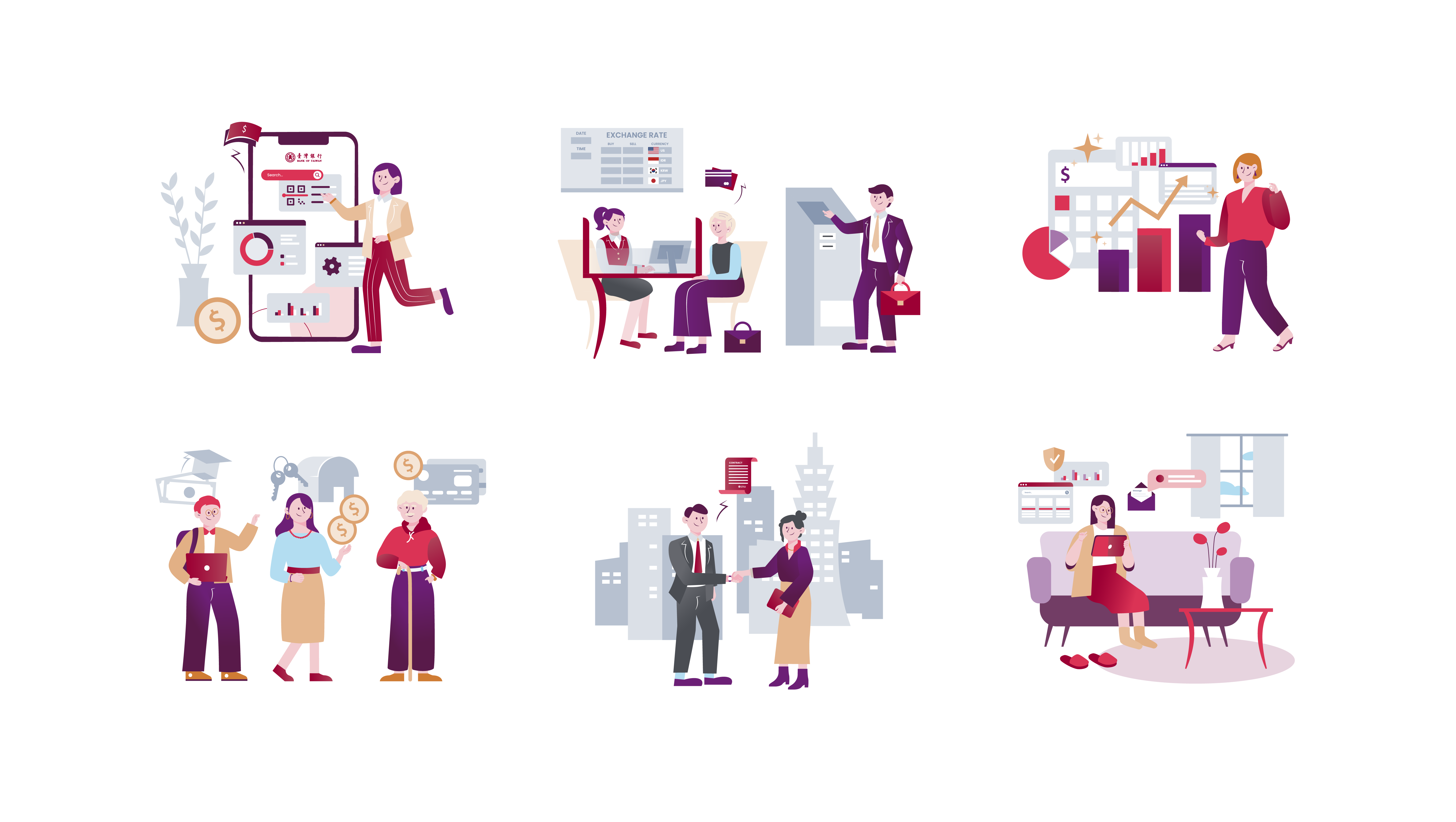 普羅思考到臺灣銀行豐富且多元的行銷主題需求,創建角色及物件元素之系統,定義插畫繪製與色彩原則,讓企業內外部得以快速瞭解如何執行與落實,面臨不同需求時,皆可有效進行拆解、重組。同時,制定臺灣銀行行員插畫的穿著及服裝之基礎表現,達到品牌管理一致性與辨識性。