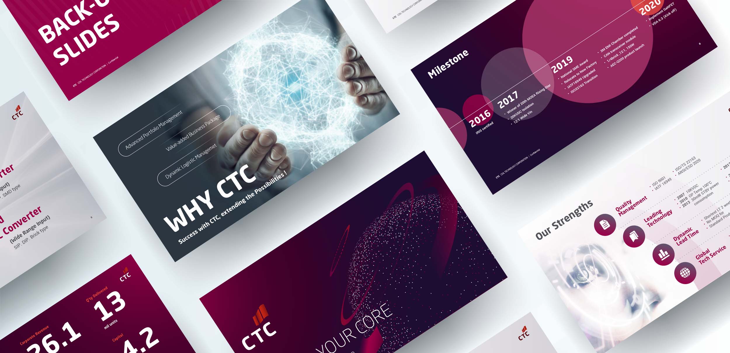 因應市場數位化溝通需求,普羅運用律動的輔助圖形、簡約的版面配置和動態的視覺表現,展現出頻譜電子的最大優勢包括:有彈性且高整合能力,能提供客戶多元解決方案、引領客戶邁向成功道路。另外,考量不同的應用環境,普羅發展icon區分各式產業類別及產品功能,梳理行銷素材內容,以清楚的資訊圖像及數據體現產品競爭力,業務溝通程序化繁為簡,一目瞭然。