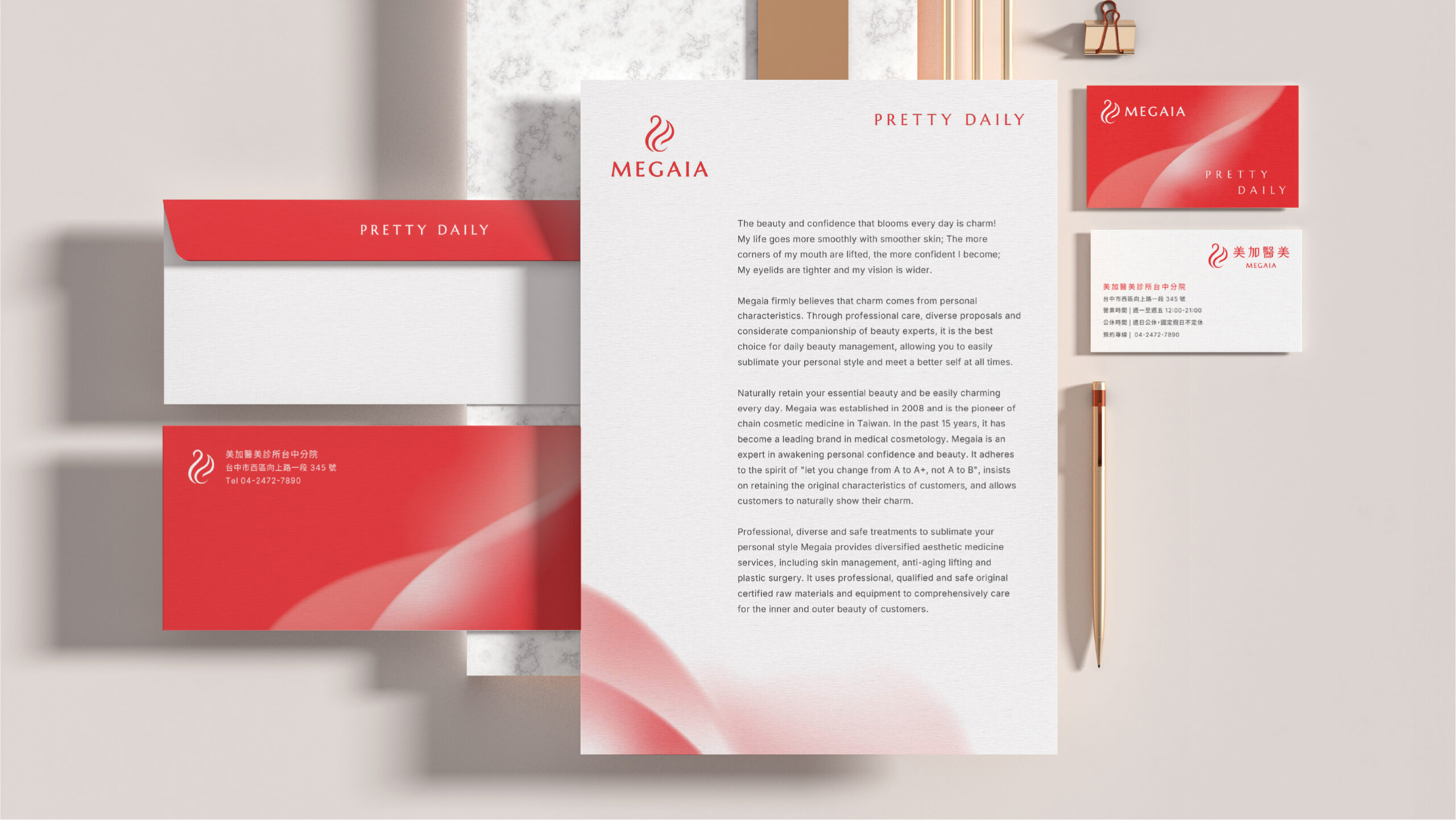 普羅透過品牌分析與品牌策略工作坊,與美加團隊共創後,以「日常 Daily」為品牌核心主旨,不再單純以效果作為醫美服務的溝通主旨,而是承諾美加給予顧客的是「自然、日常的自信美麗」,並且以細緻、體貼的五感服務讓每一位來到美加的顧客都如同回家般舒適自在,「Pretty Daily 魅力每一天」。