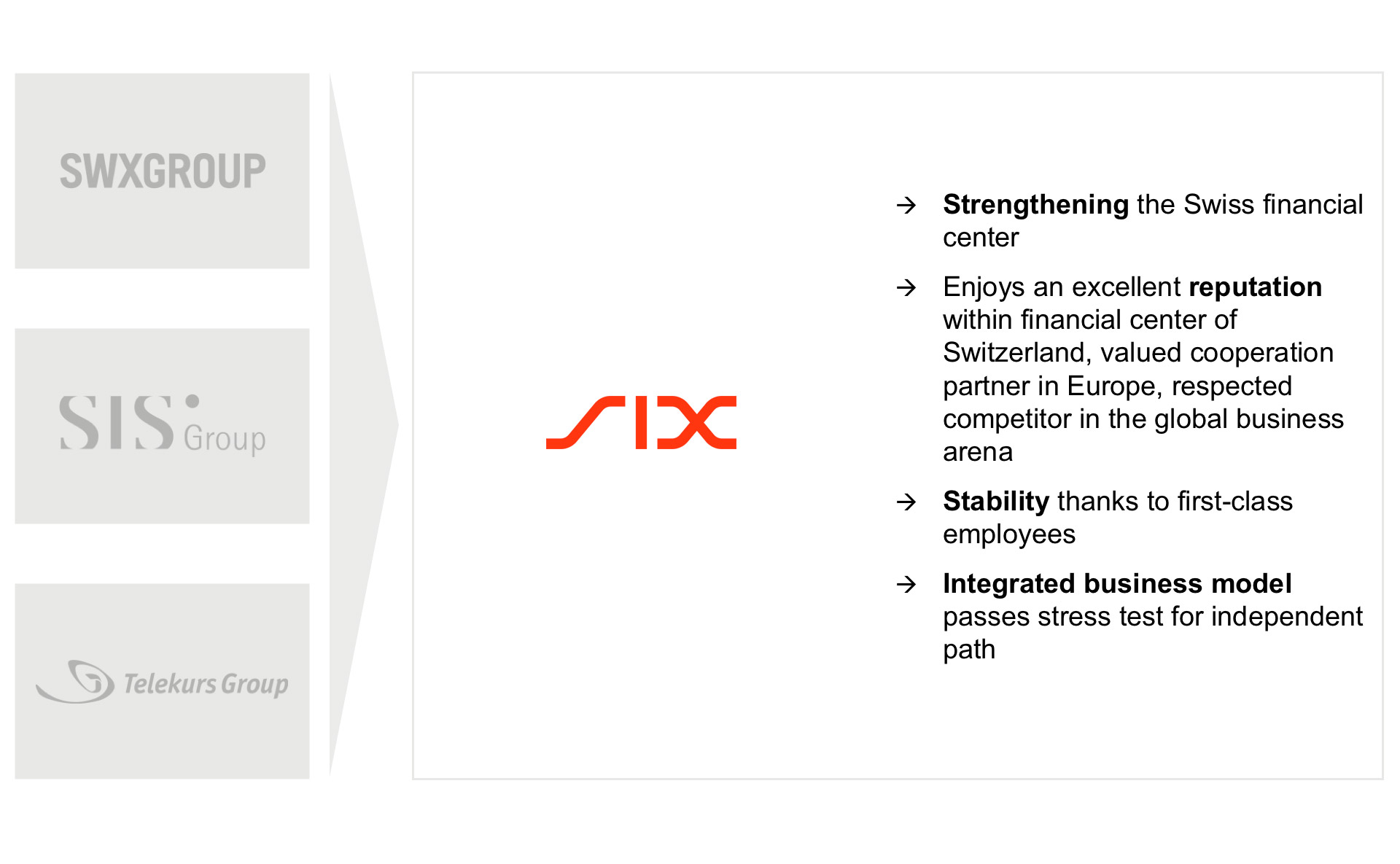在2008年,SIX Group由三大金融基礎設施服務商SWX Group、Telekurs Group和SIS Group合併而成。而SIX Group目前為瑞士金融中心營運基礎建設,致力為國際客戶提供證券交易、金融資訊或銀行有關等的多元服務。