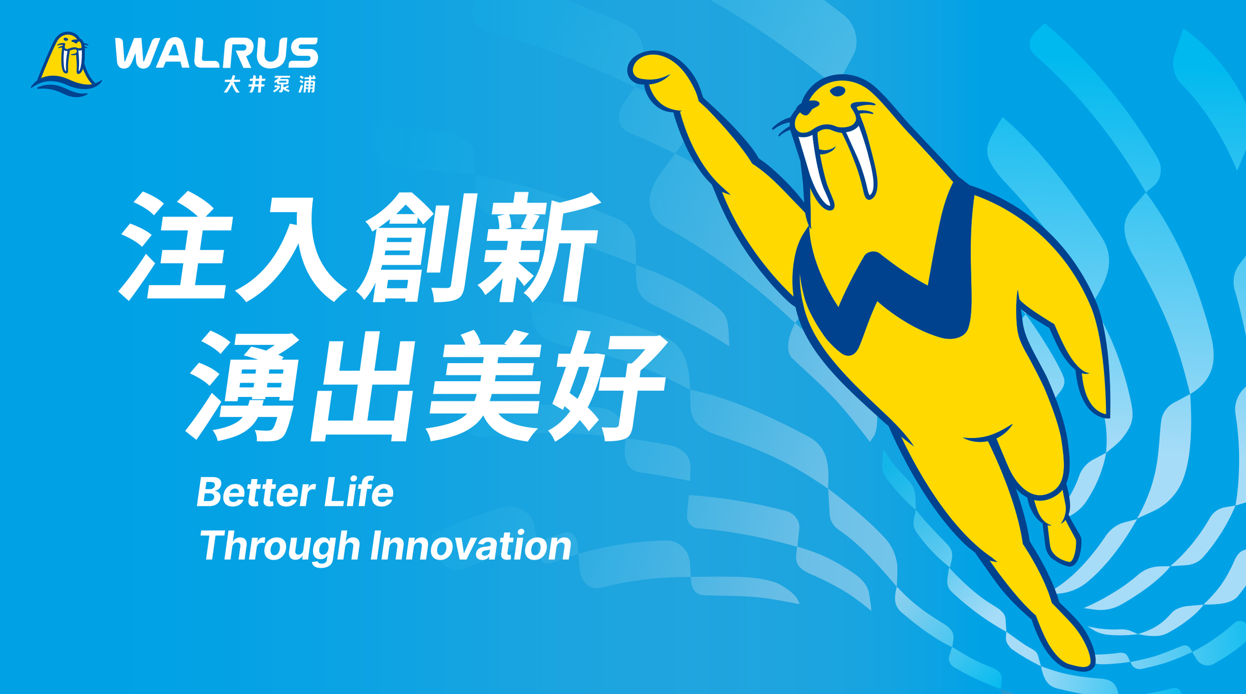 以洋流作為輔助圖形的靈感來源,將水流動充滿力量的型態轉化為品牌的視覺形象,象徵WALRUS大井泵浦如洋流般,持續有力推動美好生活,更體現出WALRUS大井泵浦佈局全球的決心。