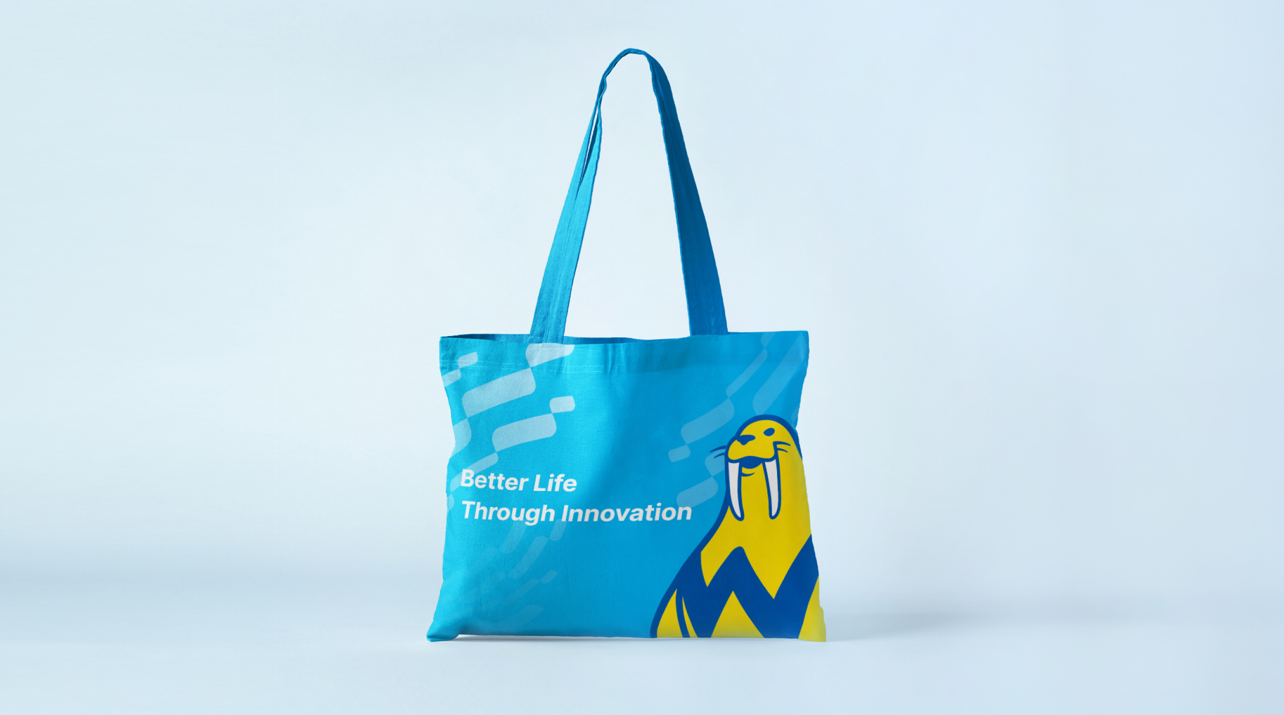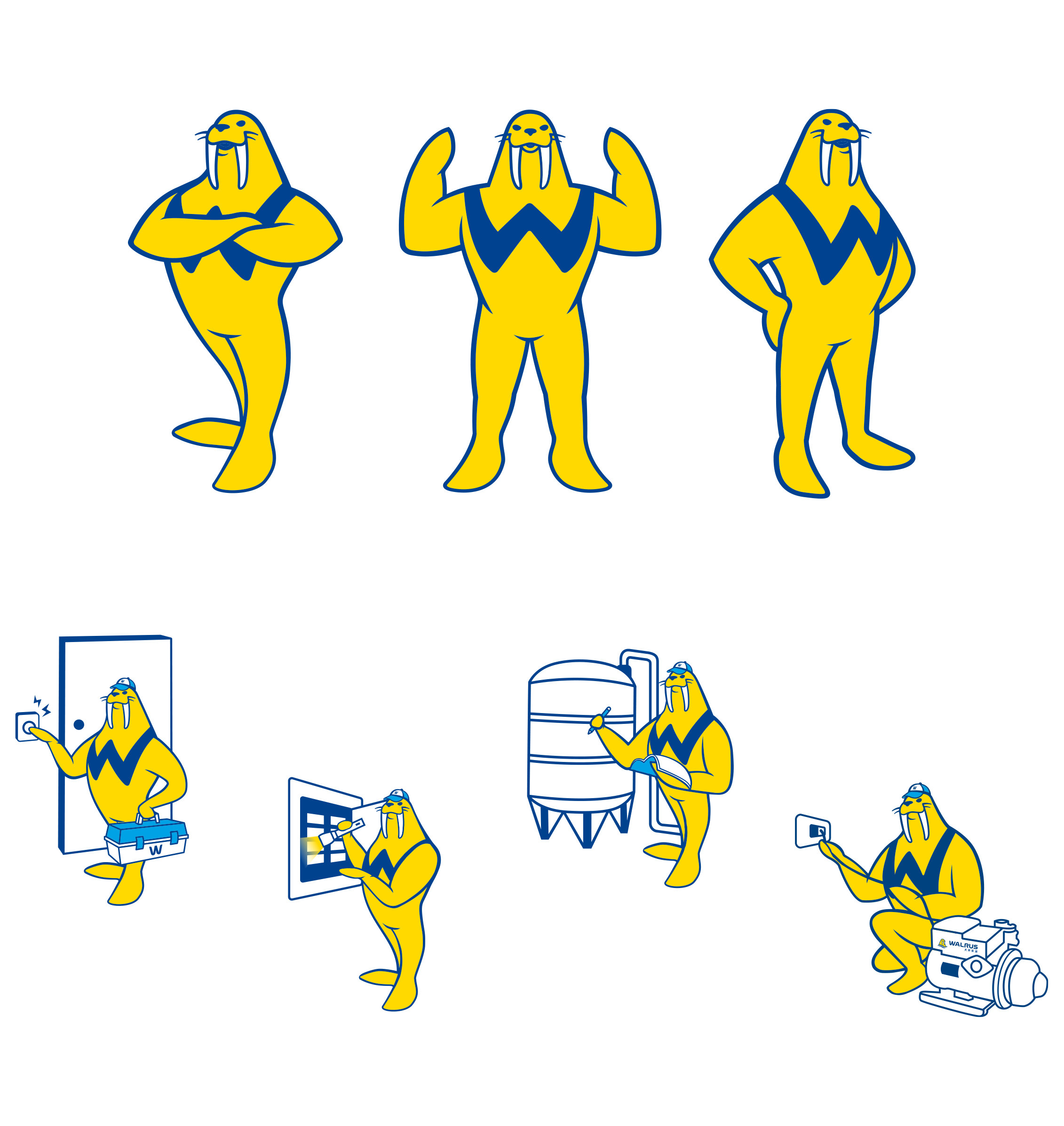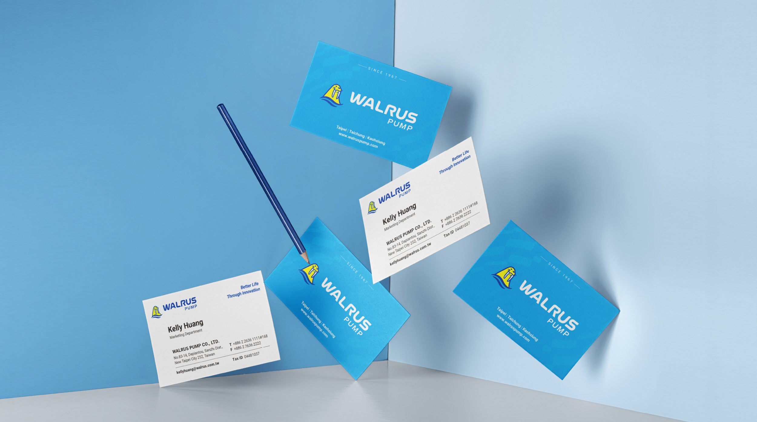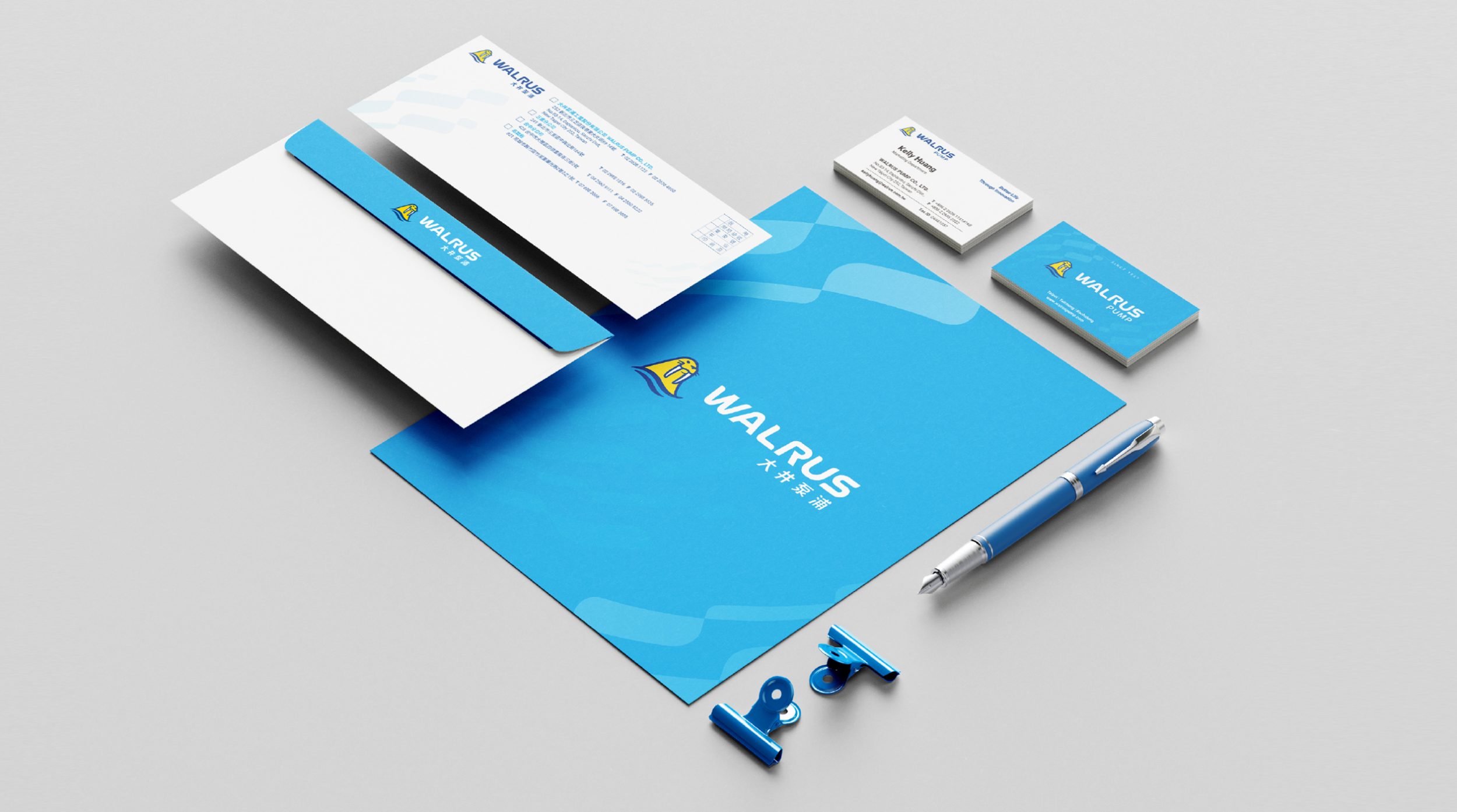 原有識別顏色較為深沈,不符合新品牌策略活力創新的特質,普羅以更鮮艷飽和的藍色,傳遞水質的清澈乾淨;使用亮黃色傳遞陽光、清爽、活力的意象,協助WALRUS大井泵浦在未來在標誌的應用上能更凸顯「海象」五官,並將標準字的角度傾斜5度,傳遞「持續精進」的核心價值,以清晰明確的識別與消費者溝通。