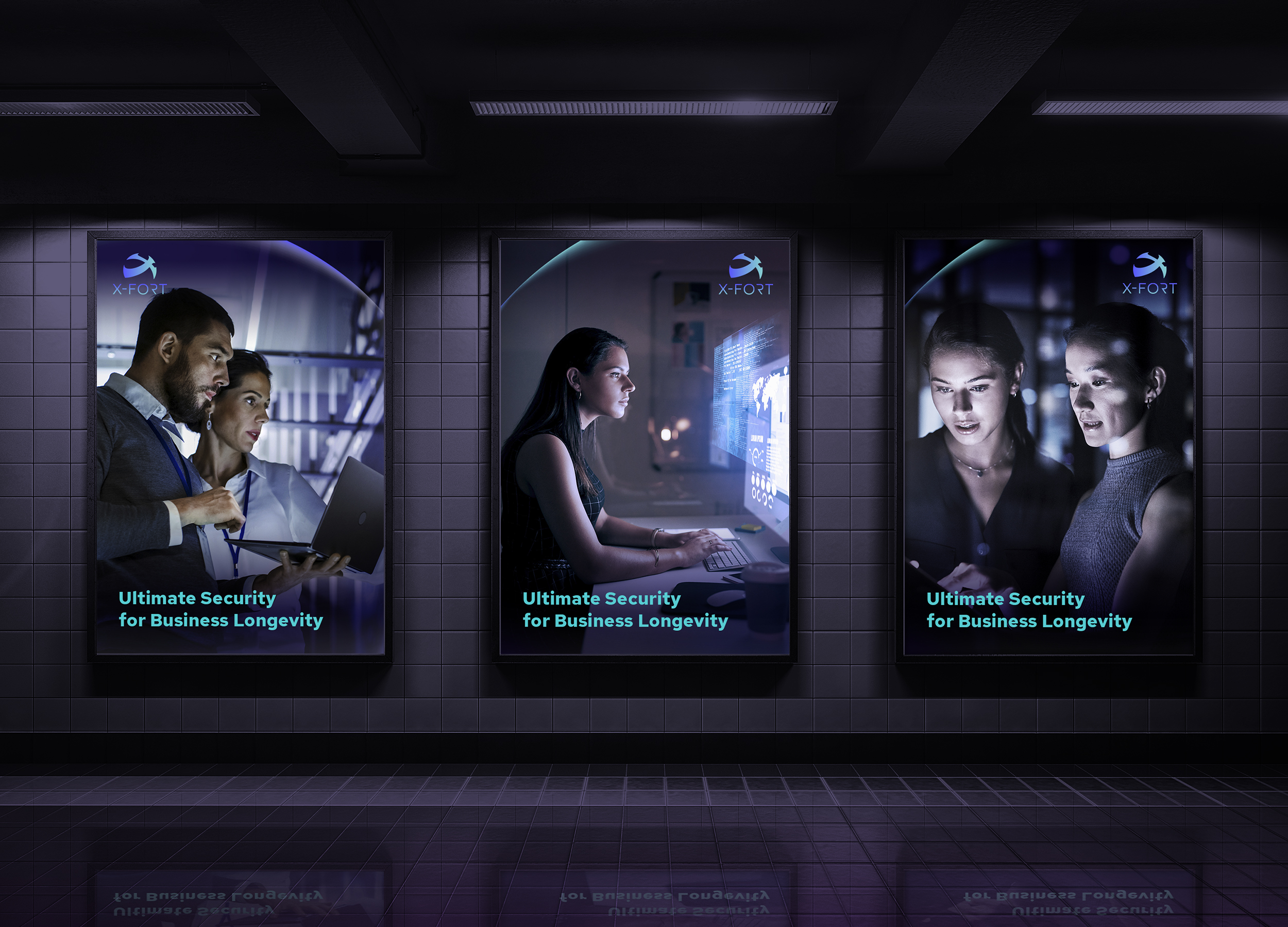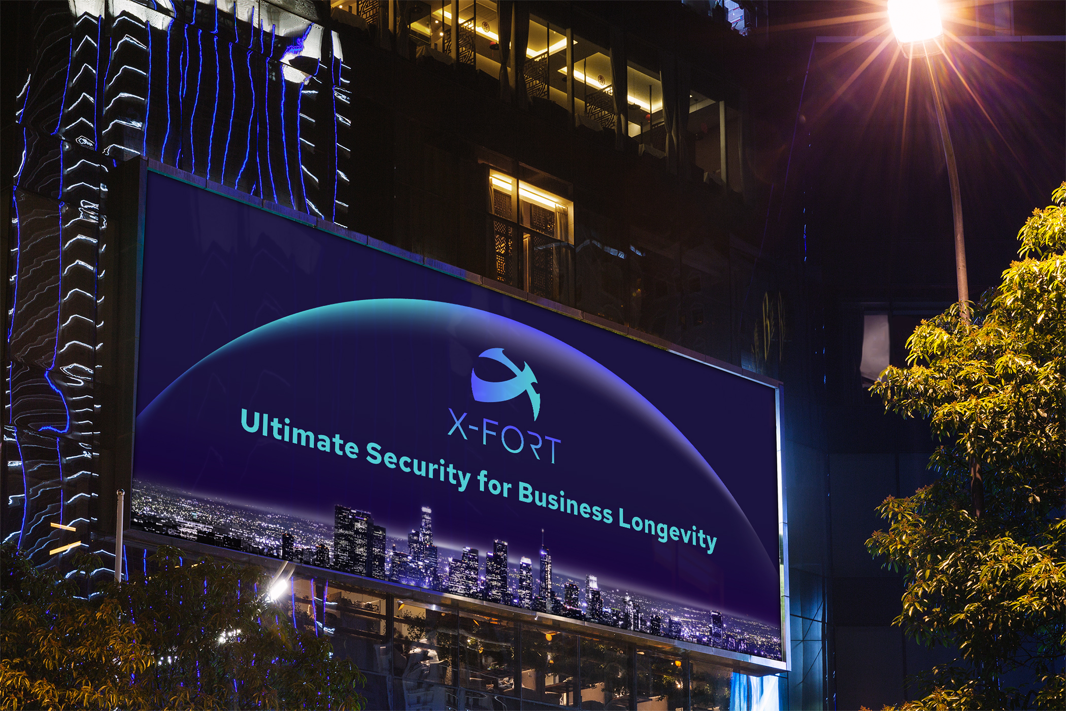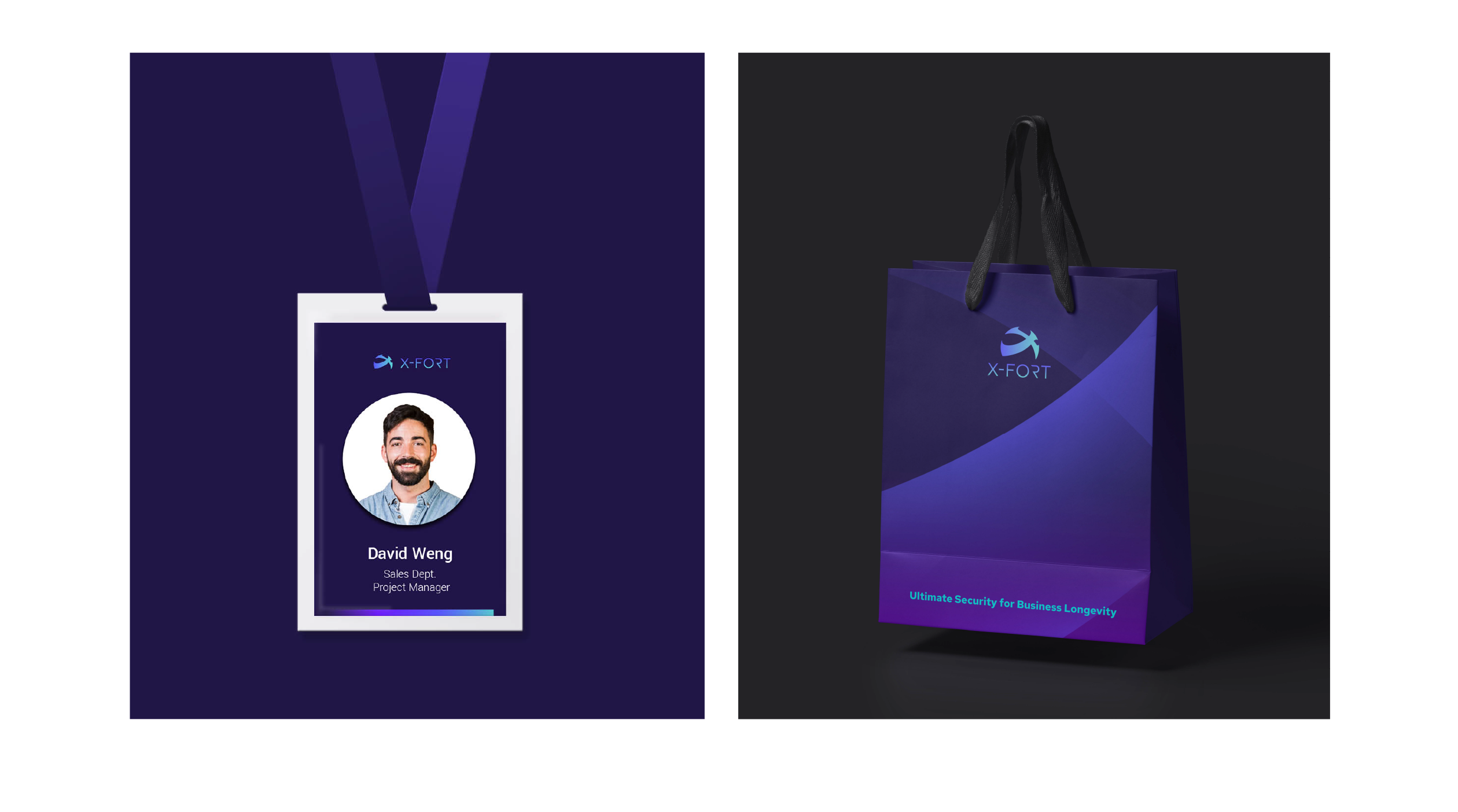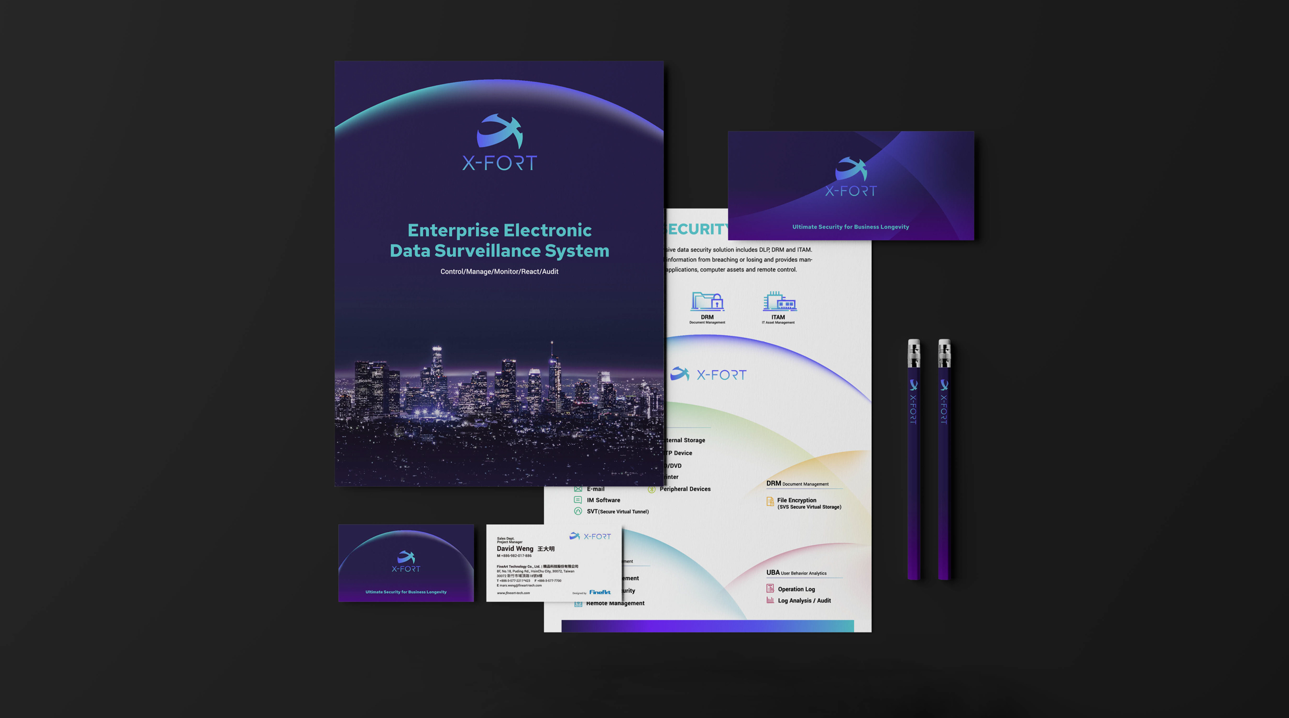 商標以包覆型態的「X」與防護罩形象結合,體現X-FORT為客戶提供全面的終端防護、極致守衛的精神。品牌整體的氛圍帶入藍紫漸層色及明暗的反差來製造科技未來感的效果,展現品牌兼具前瞻視野與高端技術的特質。 運用交疊的防護罩光線創造有層次之輔助圖形,搭配品牌圖像, 有效傳遞品牌守護資產的訊息。